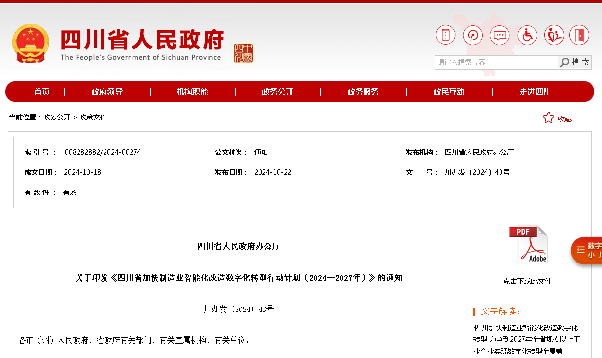 当前,互联网、大数据、云计算、人工智能等技术加速创新,引领全球产业链重组、供应链重塑、价值链重构不断深化,成为我国制造业转型升级的重要机遇。四川正处于加快转型发展的关键时期,实施“智改数转”,有利于进一步提高全要素生产率,促进质量变革、效率变革、动力变革,加快构建现代化产业体系,形成新质生产力。省委十二届三次全会鲜明提出,要坚定不移推进工业兴省制造强省,实施规模以上工业企业数字化转型智能化升级全覆盖行动,统筹推进数字产业化、产业数字化。今年2月,省委以“新春第一会”的形式召开全省推进新型工业化暨制造业智能化改造数字化转型工作会议,再次强调要围绕发展新质生产力加快制造业“智改数转”。在此背景下,按照省委、省政府要求,出台《四川省加快制造业智能化改造数字化转型行动计划(2024—2027年)》,以省政府办公厅名义印发。