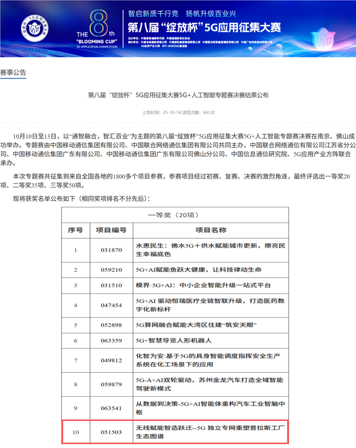 10月10日至13日,第八届“绽放杯”5G应用征集大赛5G+人工智能专题赛决赛在南京和佛山两地圆满落幕。在全国征集的1800余个项目中,由四川省宜宾普拉斯包装材料有限公司和中国联合网络通信有限公司宜宾市分公司联合申报的“无线赋能智造跃迁—5G独立专网重塑普拉斯工厂生态图谱”项目,经历初赛、复赛、决赛的激烈角逐,最终脱颖而出,斩获该赛道一等奖。